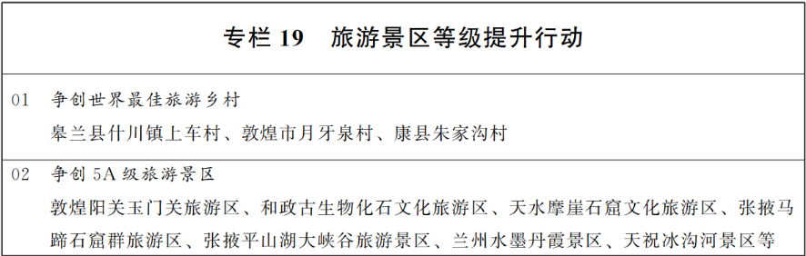 坚持以文塑旅、以旅彰文,强化系统谋划和科学布局,推动文化和旅游业态融合、产品融合、市场融合,着力完善现代旅游业体系,提升旅游供给水平和服务质量,不断放大文旅产业综合效应,走出具有甘肃特色的旅游发展之路。大力发展全域旅游,构建全域文旅康养产业融合发展新格局,打造黄河文化旅游带和丝绸之路文化旅游“千里走廊”。推动文旅设施强基焕新和微改造精提升,优化旅游公共服务设施布局和功能,建设一批全国知名度高的旅游景区和度假区,打造建设若干文化特色鲜明的国家级旅游休闲城市,创新推出更多彰显甘肃文化元素的旅游业态和产品,提升“如意甘肃”旅游品牌影响力。培育“文旅+”“+文旅”新业态,发展智慧旅游、强化智慧景区建设,推动嘉峪关关城、天水麦积山、张掖七彩丹霞、永靖刘家峡等知名景区(度假区)不断丰富业态、持续优化管理,创建一批国家级、世界级文化旅游品牌。推进自驾游目的地和营地建设。打造“陇上乡遇”乡村旅游品牌。发展假日经济、避暑等旅游业态。实施红色旅游创新提升行动,传承红色基因,开发红色陇东、长征会师、载人航天等经典线路。加快推进会宁、华池、高台、迭部创建红色旅游融合发展区,提升腊子口战役遗址、两当兵变旧址等16个国家红色旅游经典景区品质,推动“红色沃土、长征丰碑、浴血河西”三大红色文化旅游区建设。构建全方位、立体化宣传营销体系,提升入境游便利化国际化水平。实施文旅产业经营主体引育专项计划,加快引育文旅运营、在线旅游服务、文创产品开发、演艺经纪、酒店管理等企业,加快培育壮大文旅经营主体,增强文旅产业发展支撑力。
